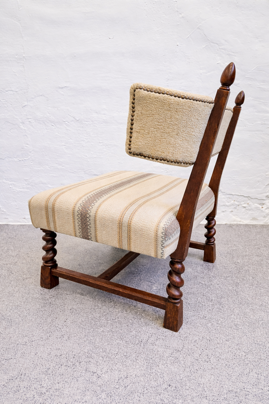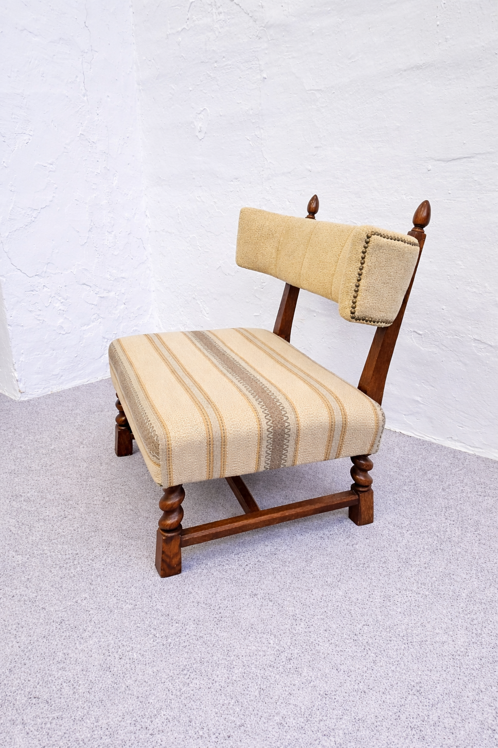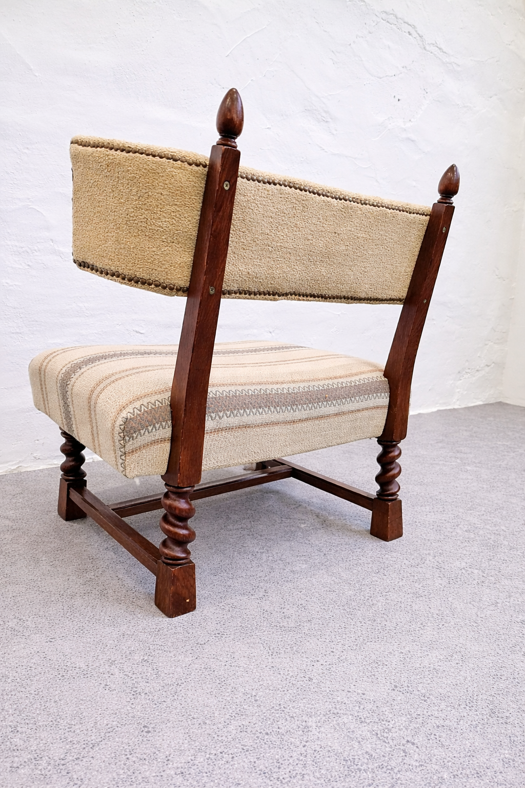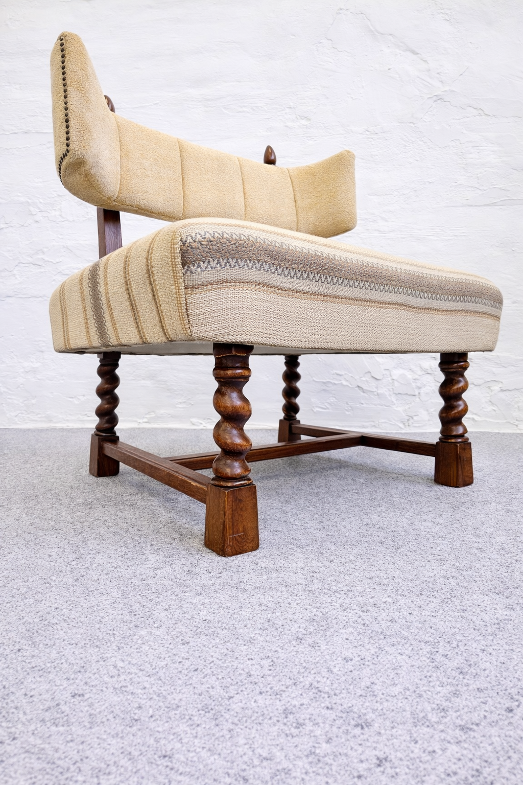The turned front legs and cross stretcher detail reflect traditional Central European woodworking, while the overall silhouette already moves towards a more restrained, modern lounge typology.