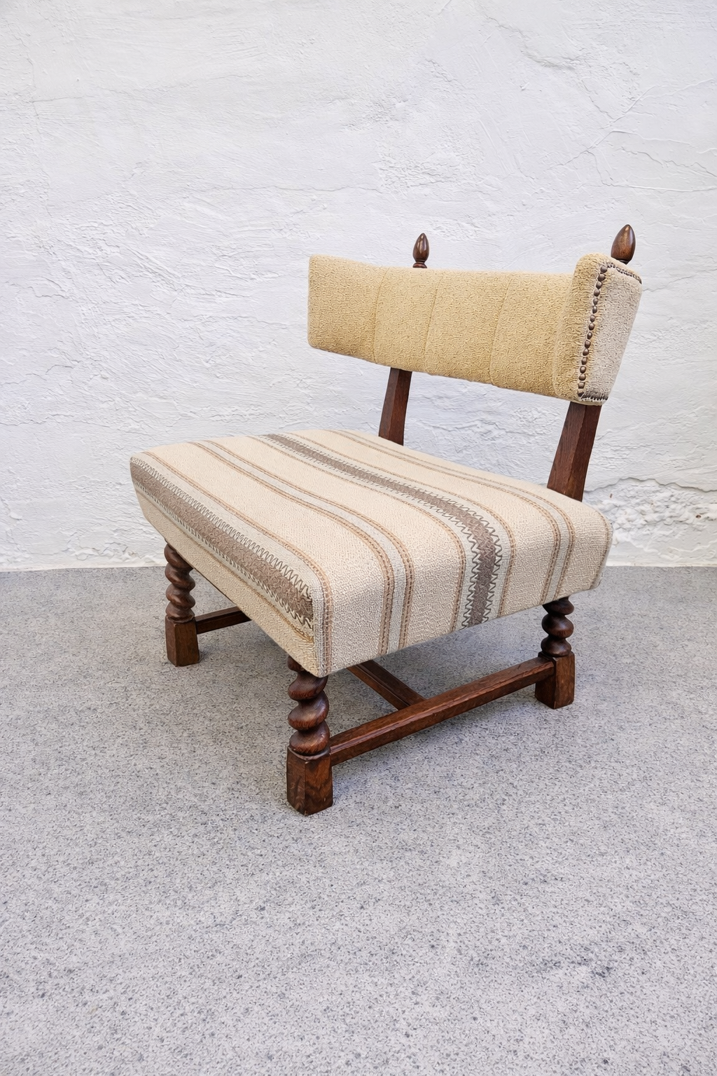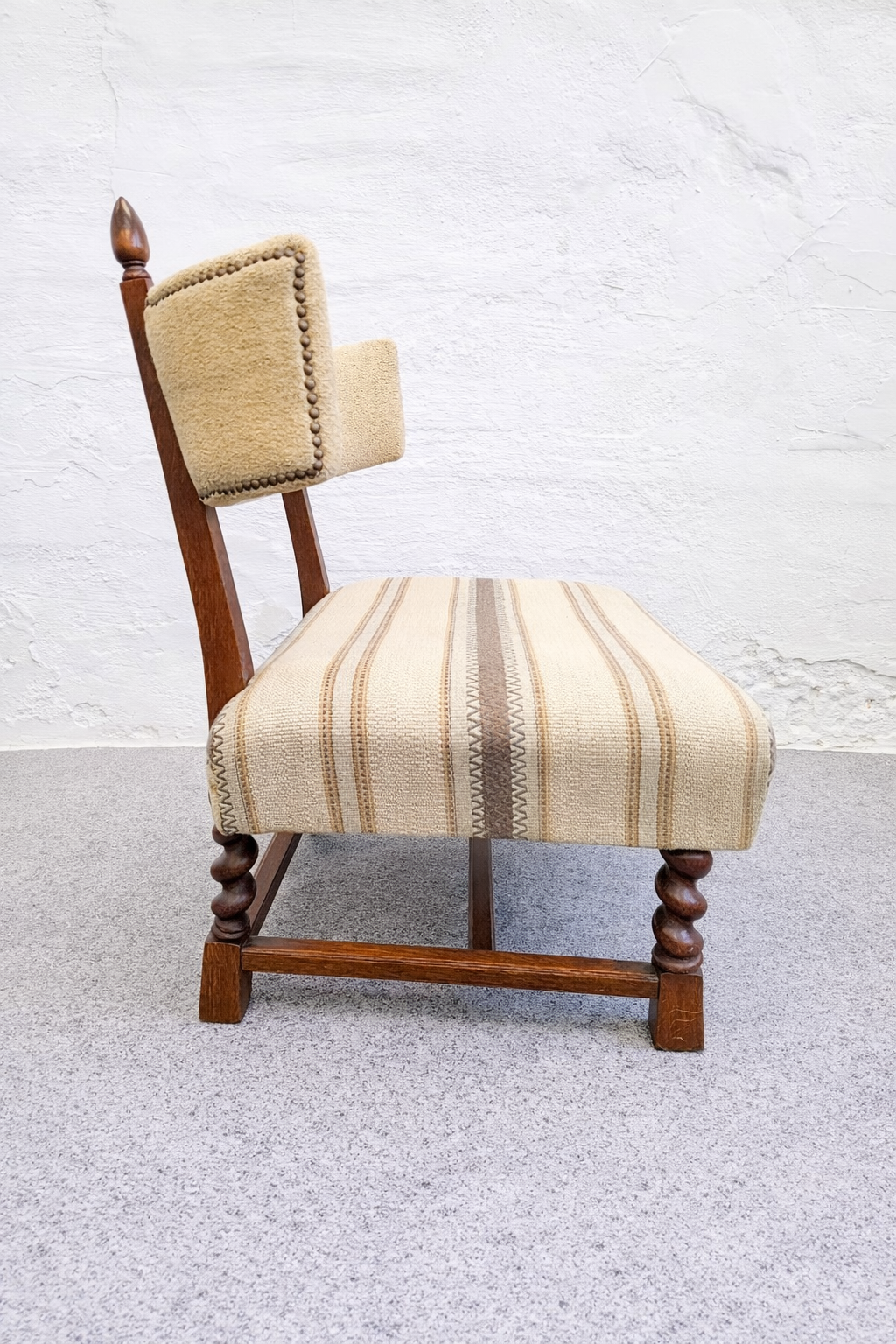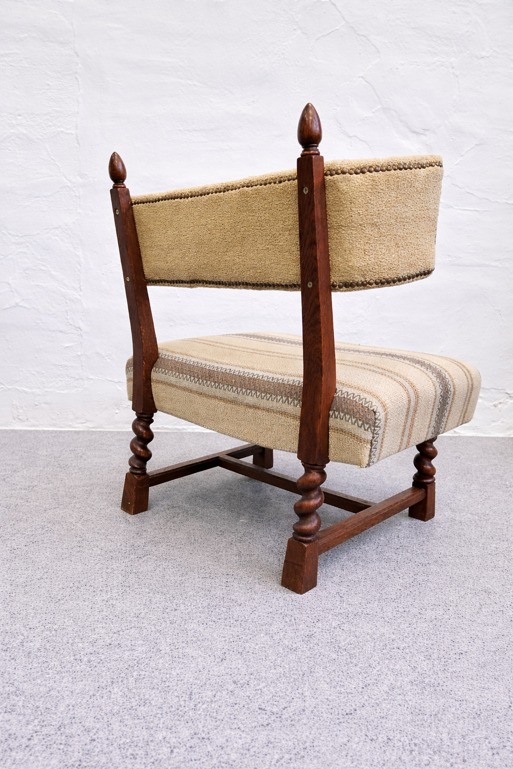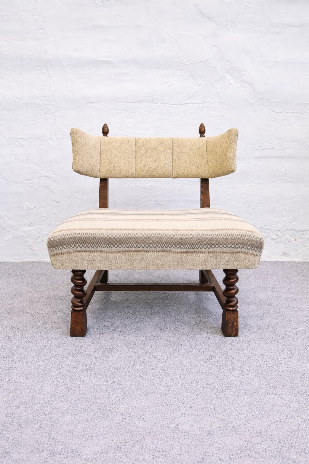 The turned front legs and cross stretcher detail reflect traditional Central European woodworking, while the overall silhouette already moves towards a more restrained, modern lounge typology.