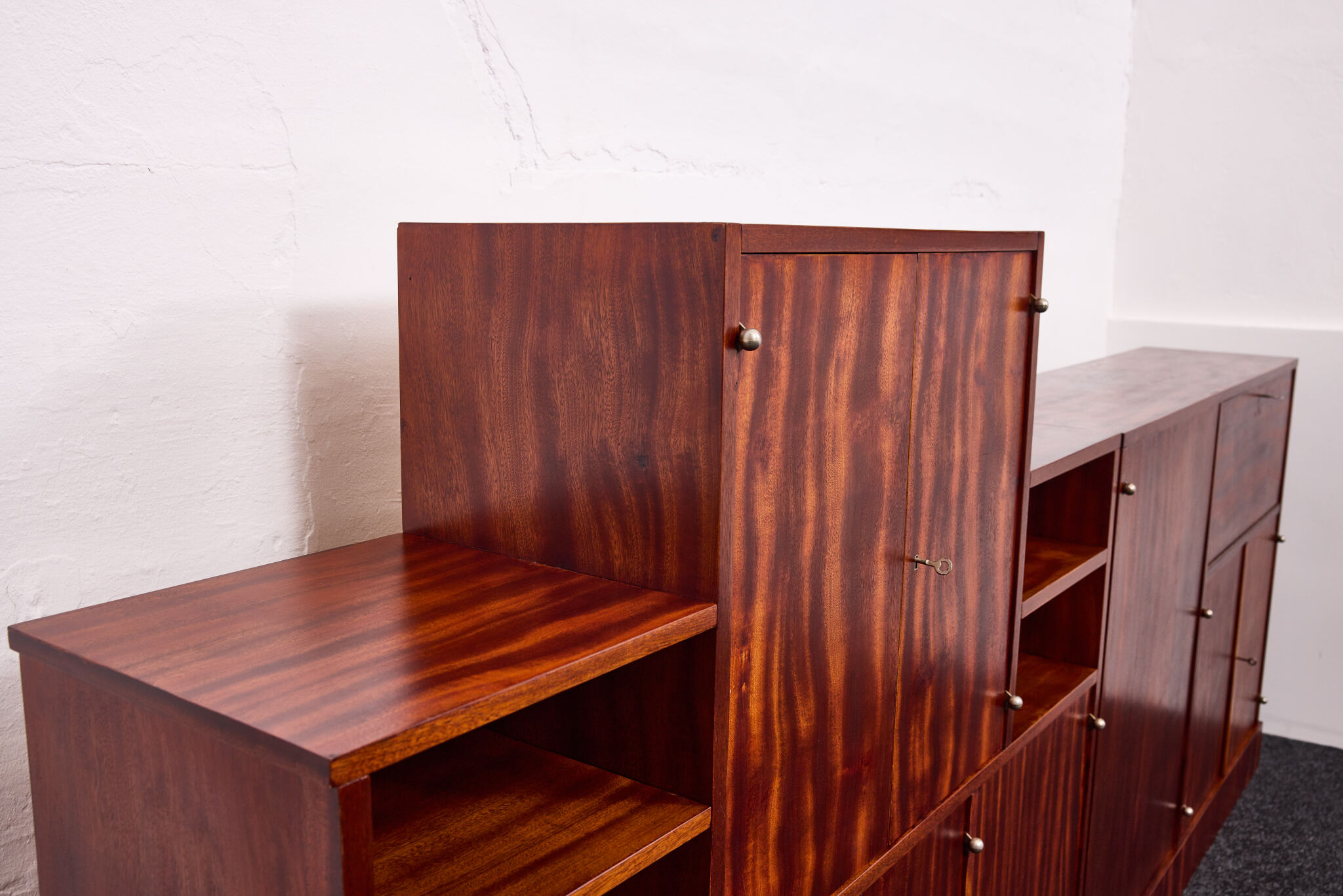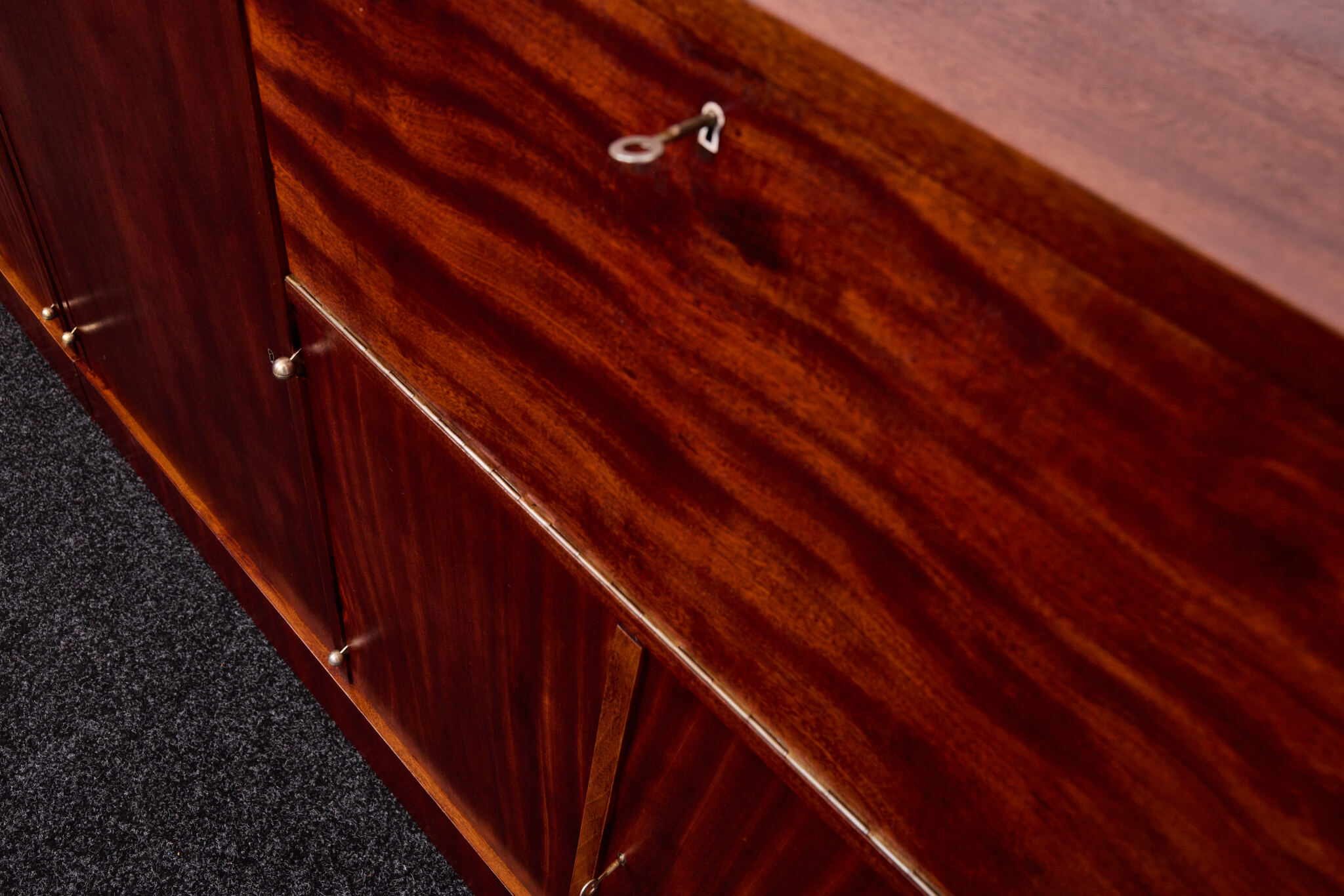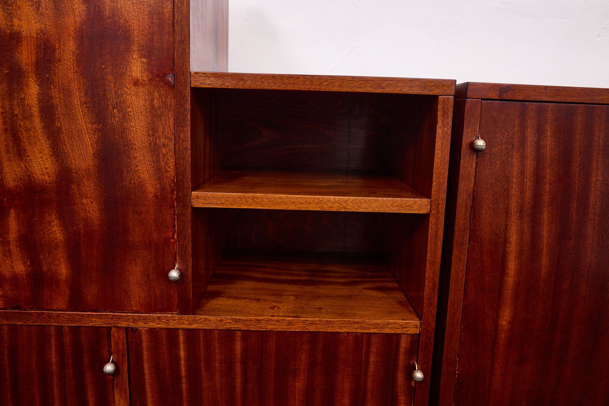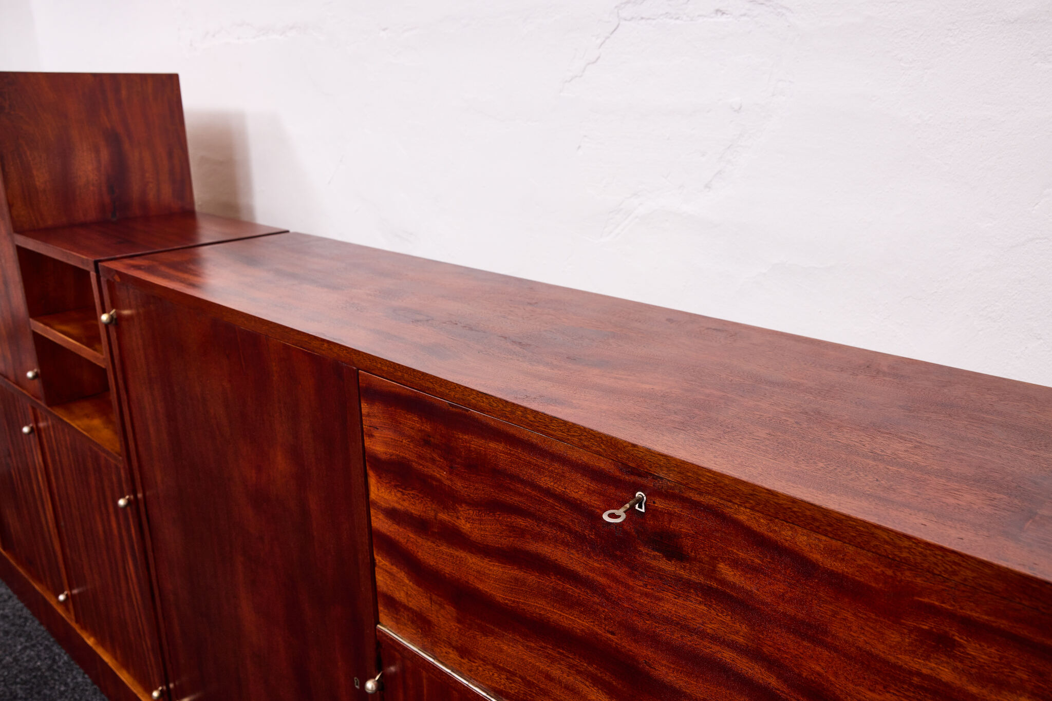 Crafted from solid wood and veneered in bookmatched Cuban mahogany, the ensemble exemplifies the discreet luxury of high Viennese modernism. The mahogany’s deep luster and ribbon grain pattern signal both exclusivity and masterful woodworking, while the cabinetry’s rational proportions reflect Frank’s evolving departure from Viennese Secessionist ornament toward a more functional and human-centered modernity.