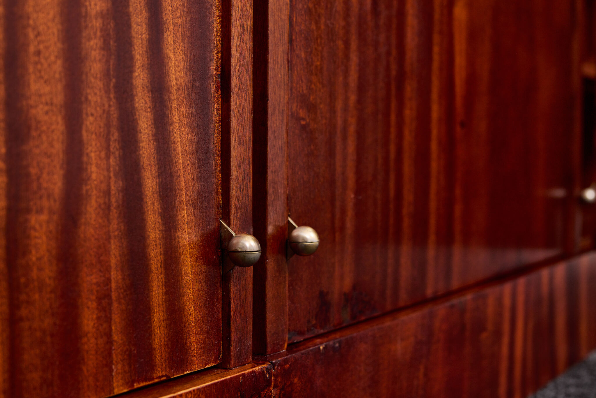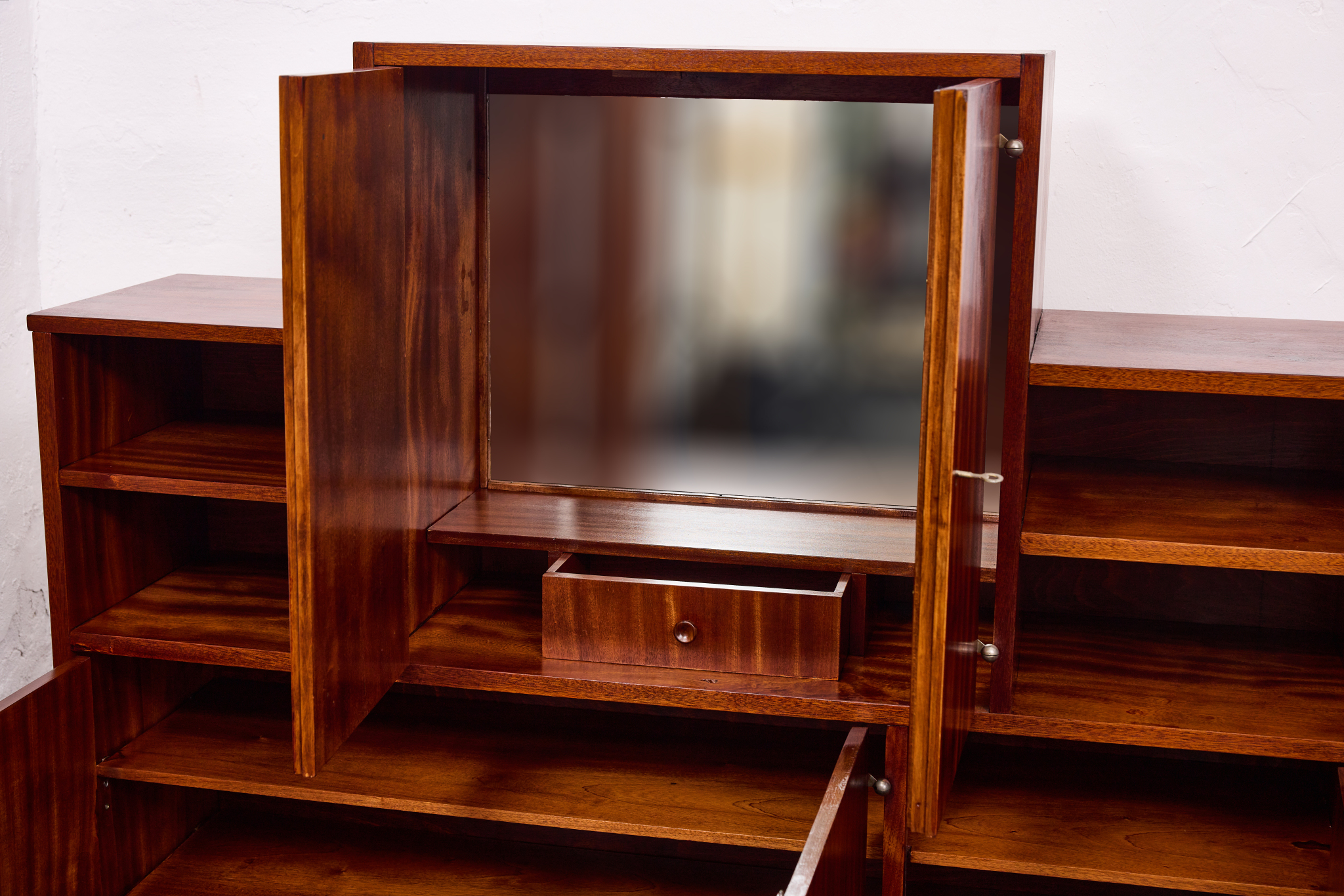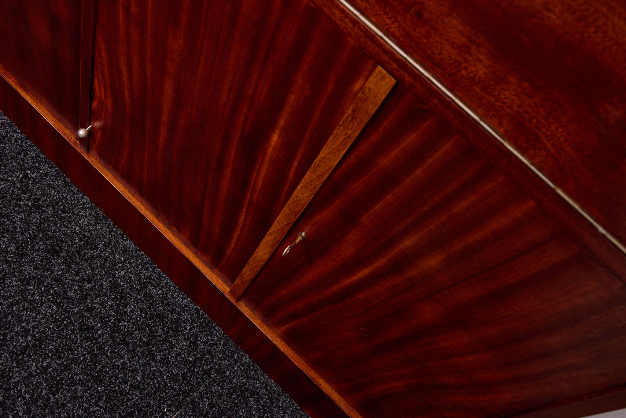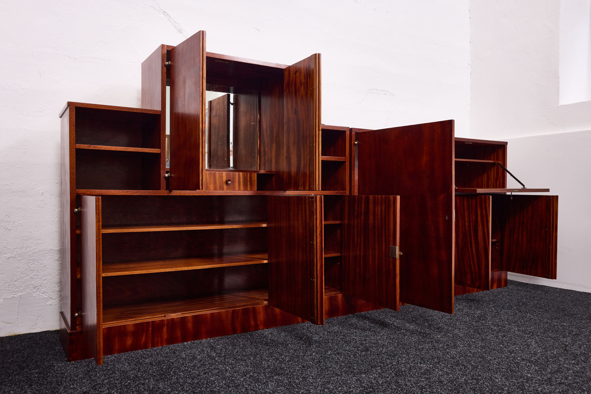 Crafted from solid wood and veneered in bookmatched Cuban mahogany, the ensemble exemplifies the discreet luxury of high Viennese modernism. The mahogany’s deep luster and ribbon grain pattern signal both exclusivity and masterful woodworking, while the cabinetry’s rational proportions reflect Frank’s evolving departure from Viennese Secessionist ornament toward a more functional and human-centered modernity.