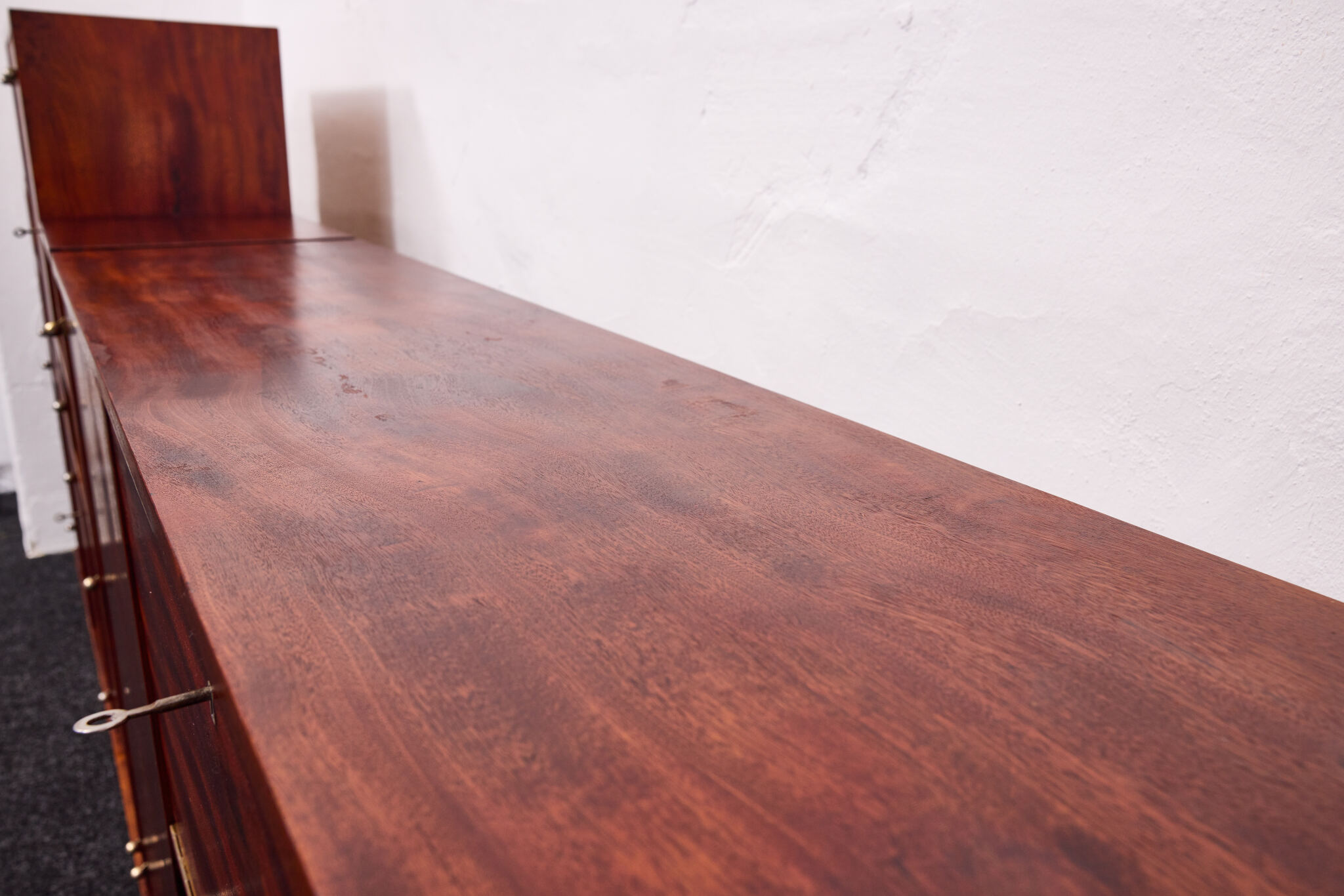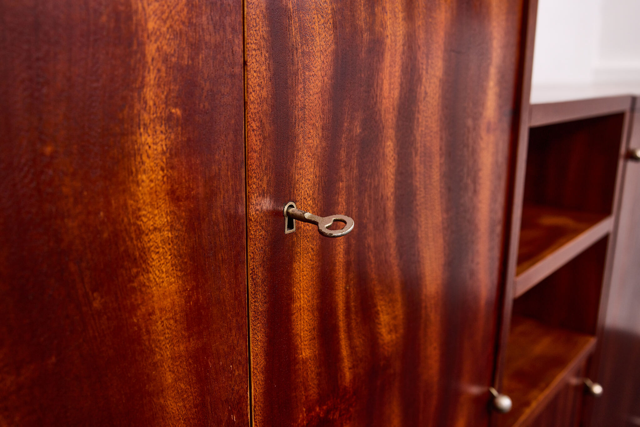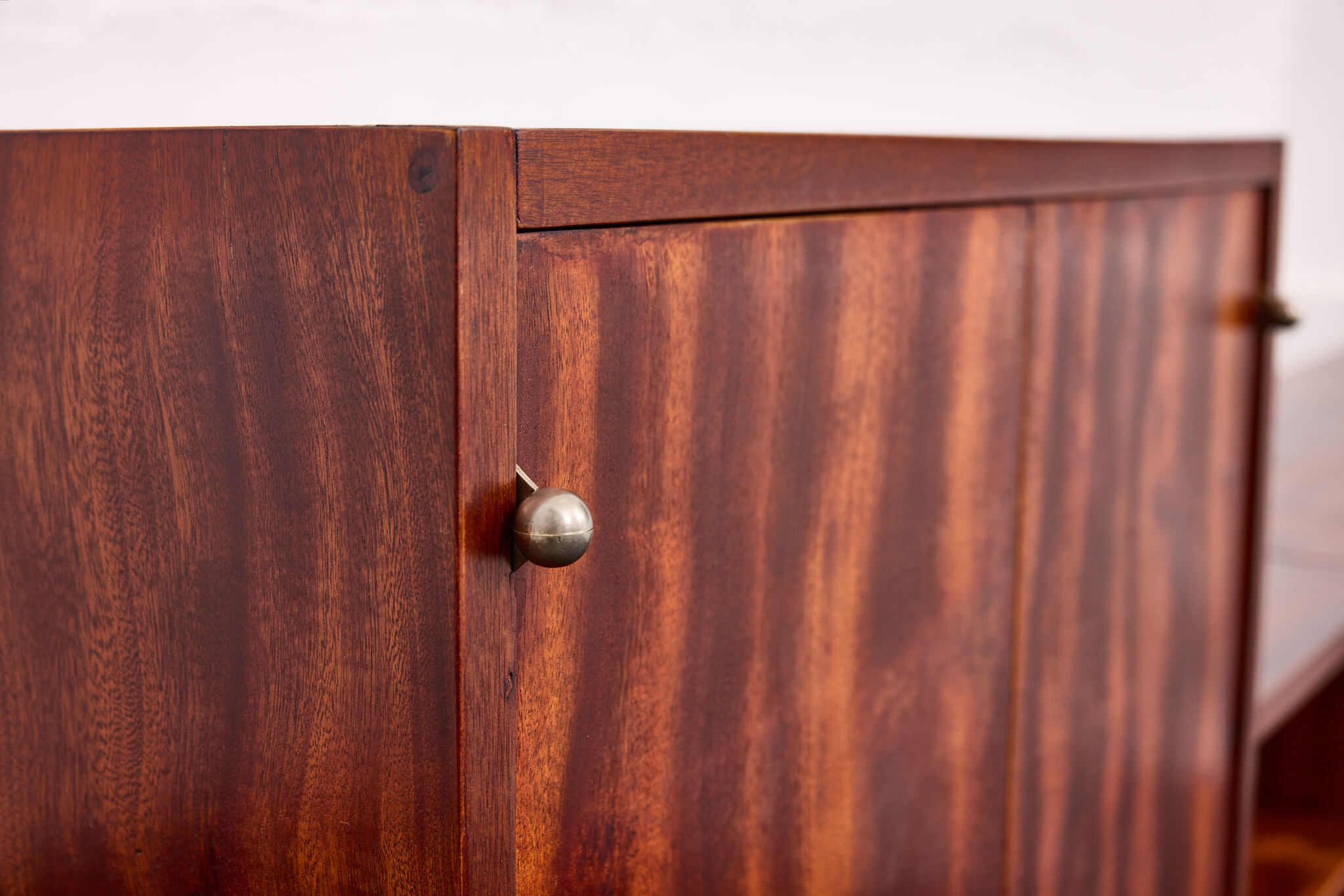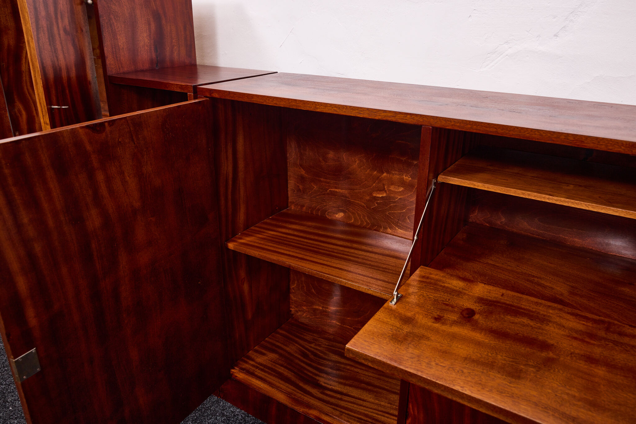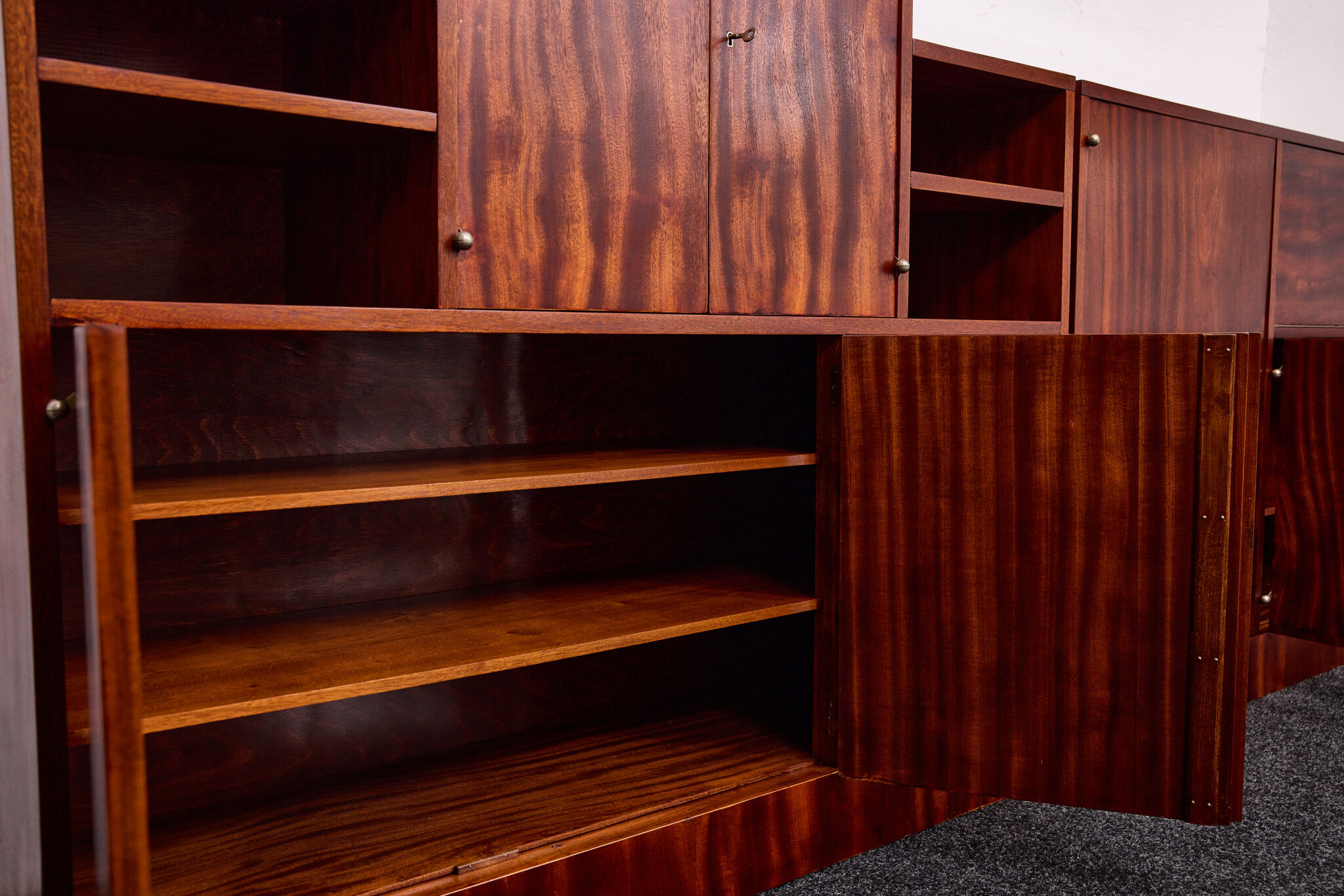 Crafted from solid wood and veneered in bookmatched Cuban mahogany, the ensemble exemplifies the discreet luxury of high Viennese modernism. The mahogany’s deep luster and ribbon grain pattern signal both exclusivity and masterful woodworking, while the cabinetry’s rational proportions reflect Frank’s evolving departure from Viennese Secessionist ornament toward a more functional and human-centered modernity.