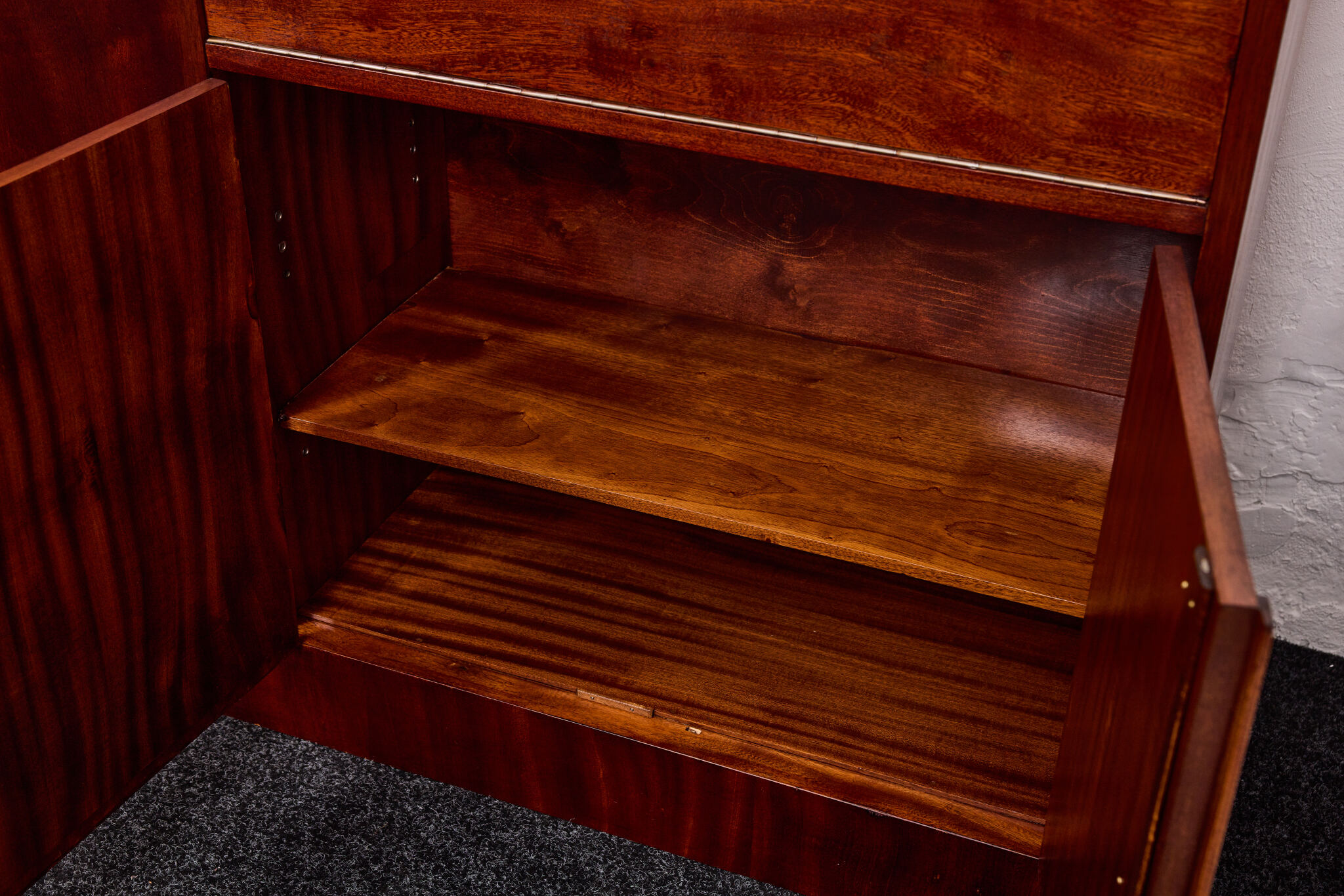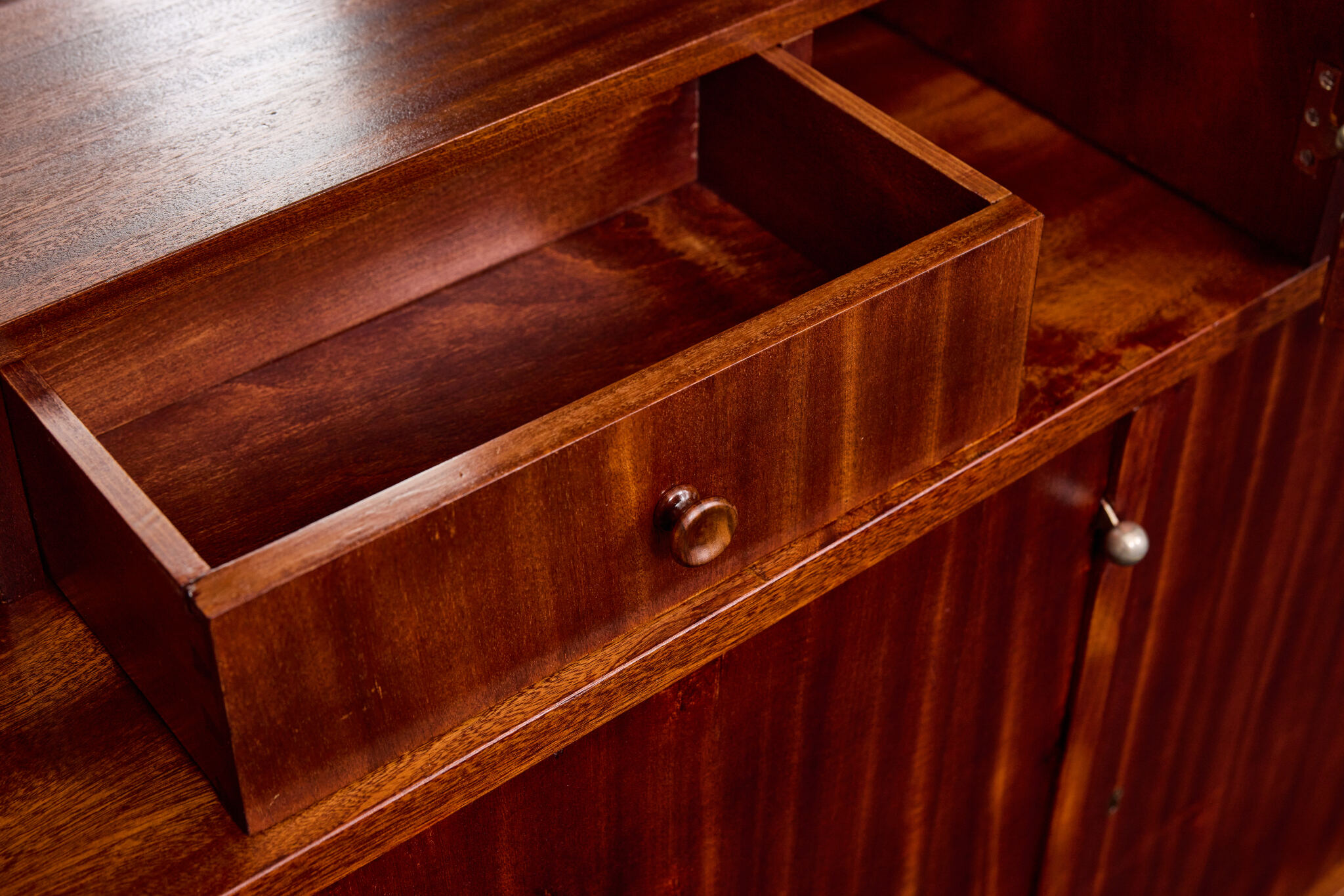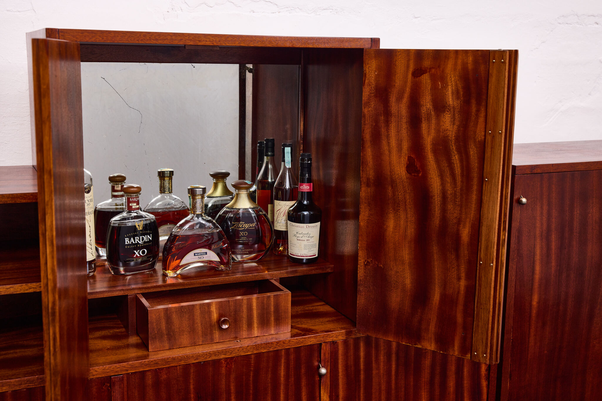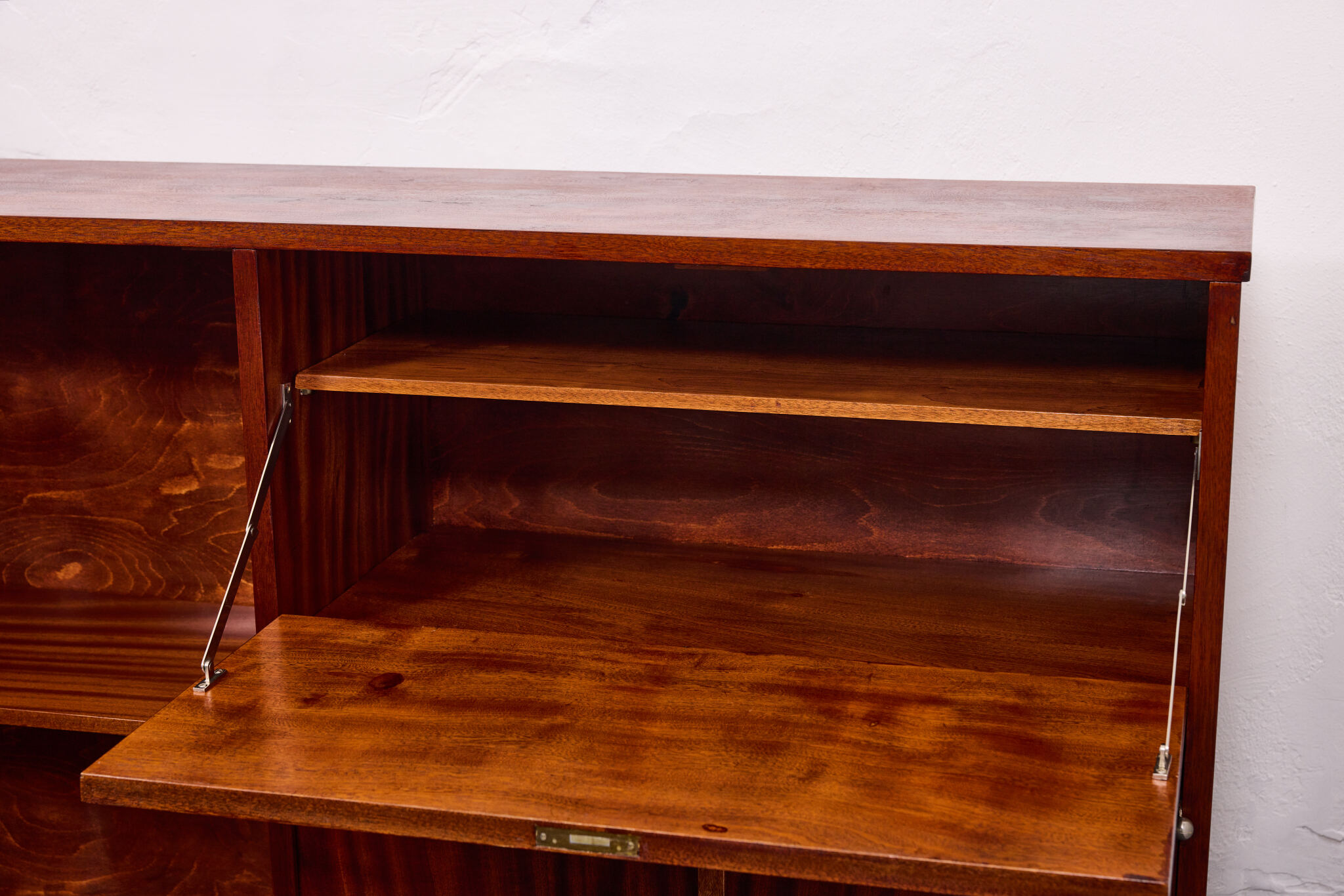 Crafted from solid wood and veneered in bookmatched Cuban mahogany, the ensemble exemplifies the discreet luxury of high Viennese modernism. The mahogany’s deep luster and ribbon grain pattern signal both exclusivity and masterful woodworking, while the cabinetry’s rational proportions reflect Frank’s evolving departure from Viennese Secessionist ornament toward a more functional and human-centered modernity.
