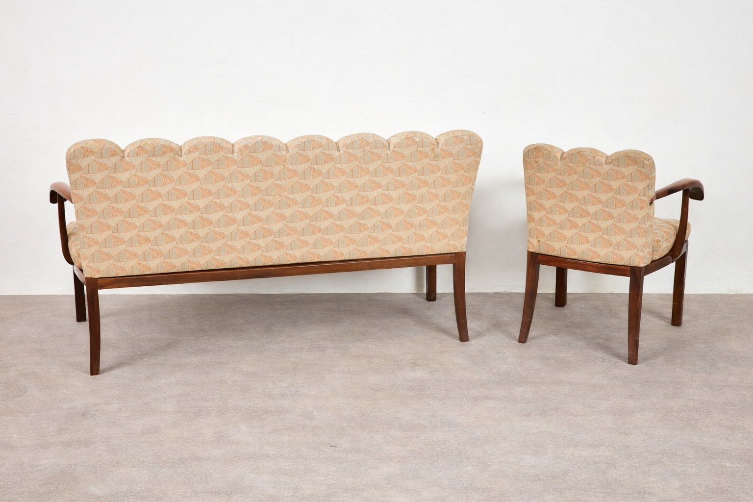 Both pieces are fully upholstered on the reverse, allowing free placement within a dining or salon interior. Conceived as a unified dining ensemble, this set was made for a representative interior rather than mass production, making it a rare and highly collectible example of Central European modern dining furniture.