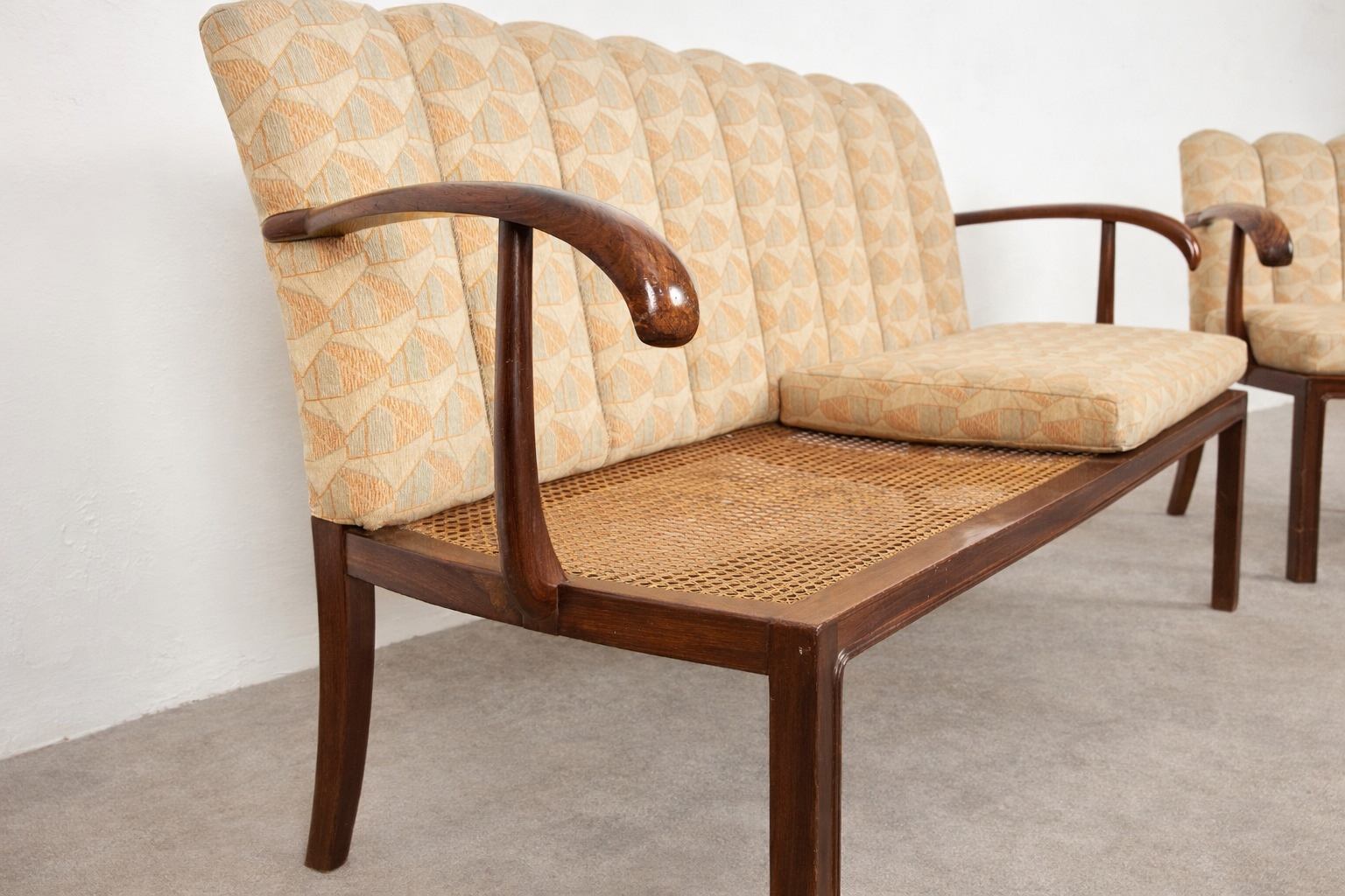 A key and rare feature is the exceptional survival of the ORIGINAL upholstery and ORIGINAL seat cushions. The seating surfaces are supported by original Viennese cane work (Wiener Geflecht). The bench retains its cane seat fully original, while the armchair underwent careful, period-correct restoration due to earlier damage. The seat cushions remain original, with African fibre stuffing and spring support, and the fixed backrest upholstery is entirely original, showing only light, authentic wear.