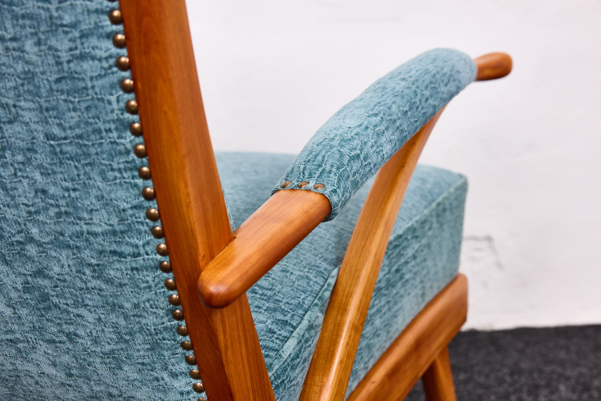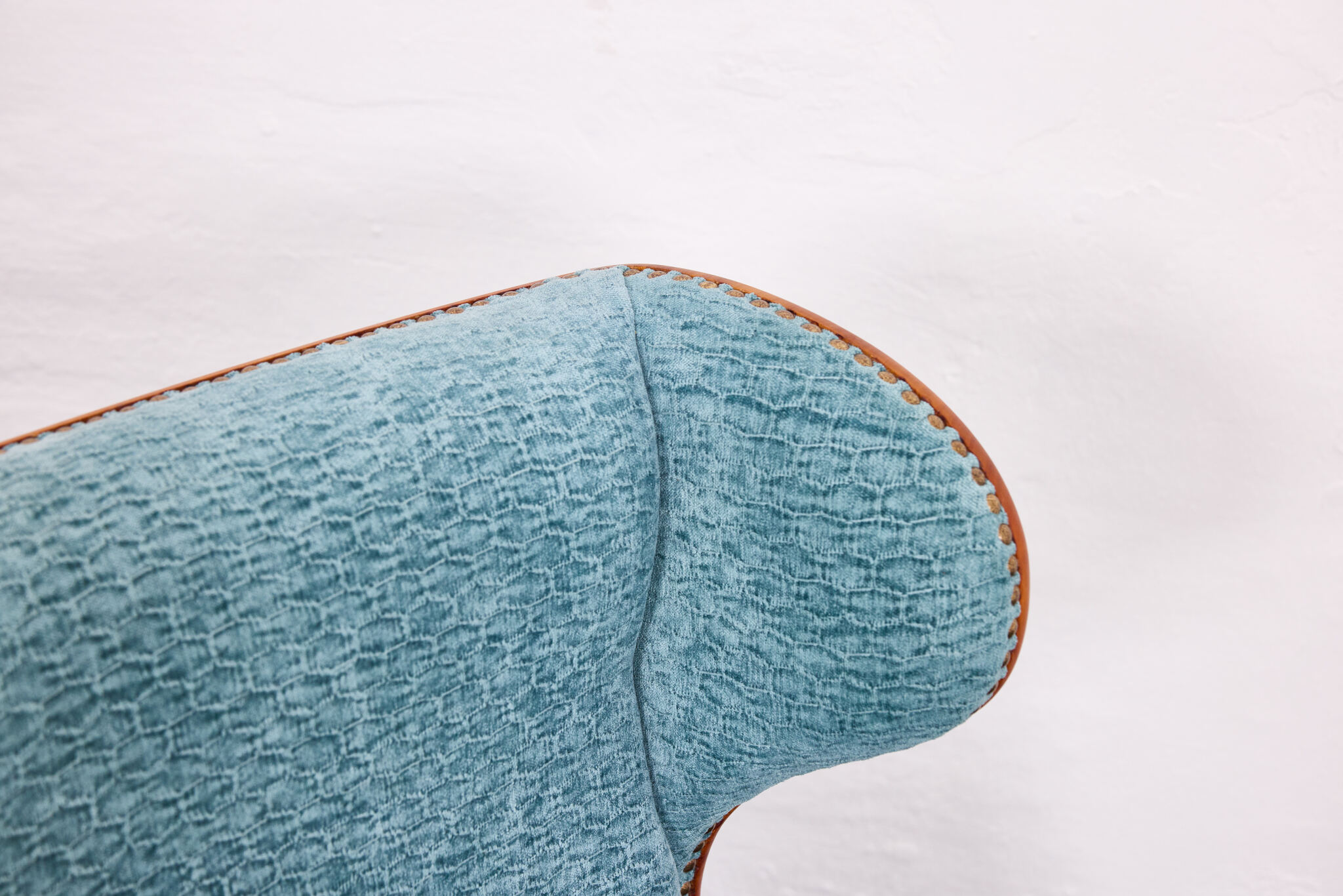 Newly upholstered in a luxurious, hand-printed turquoise ( blue) chenille fabric by ReAI Tessuti, the soft texture and subtle pattern add a layer of refined sophistication.