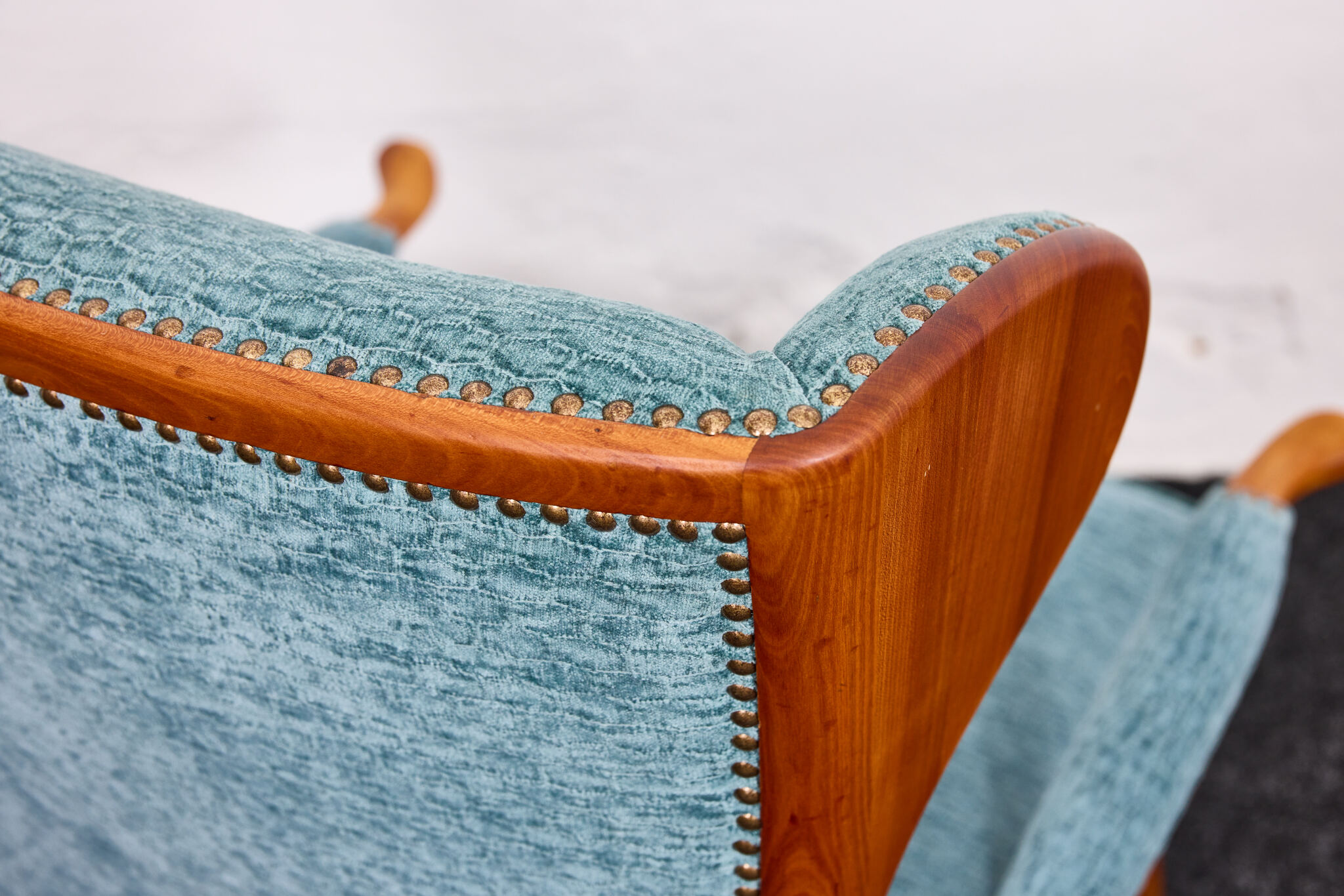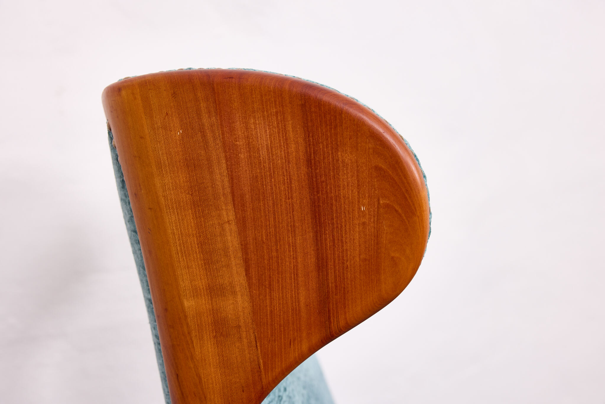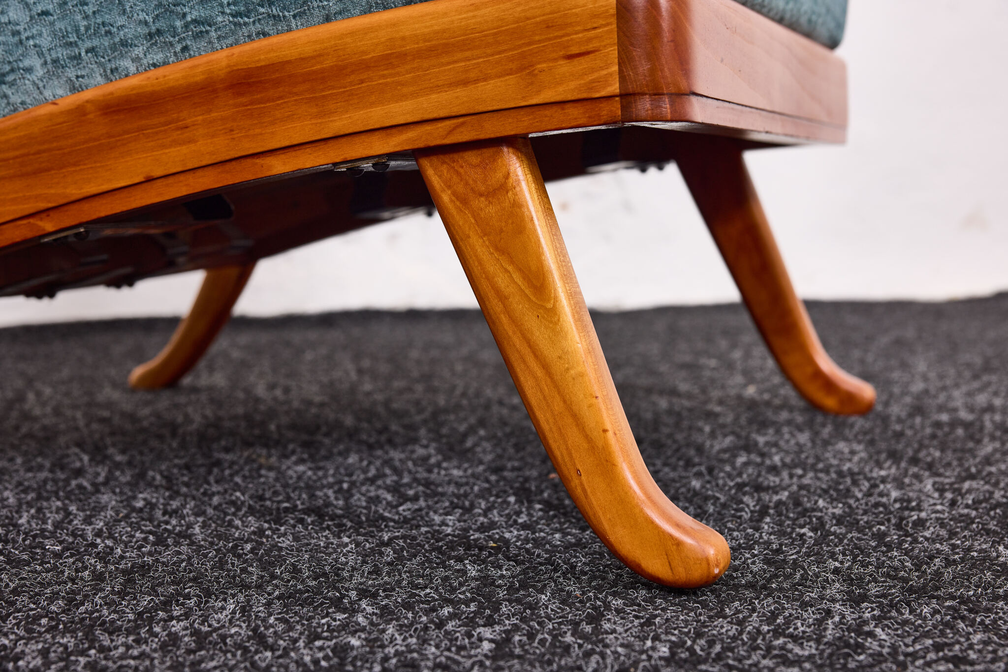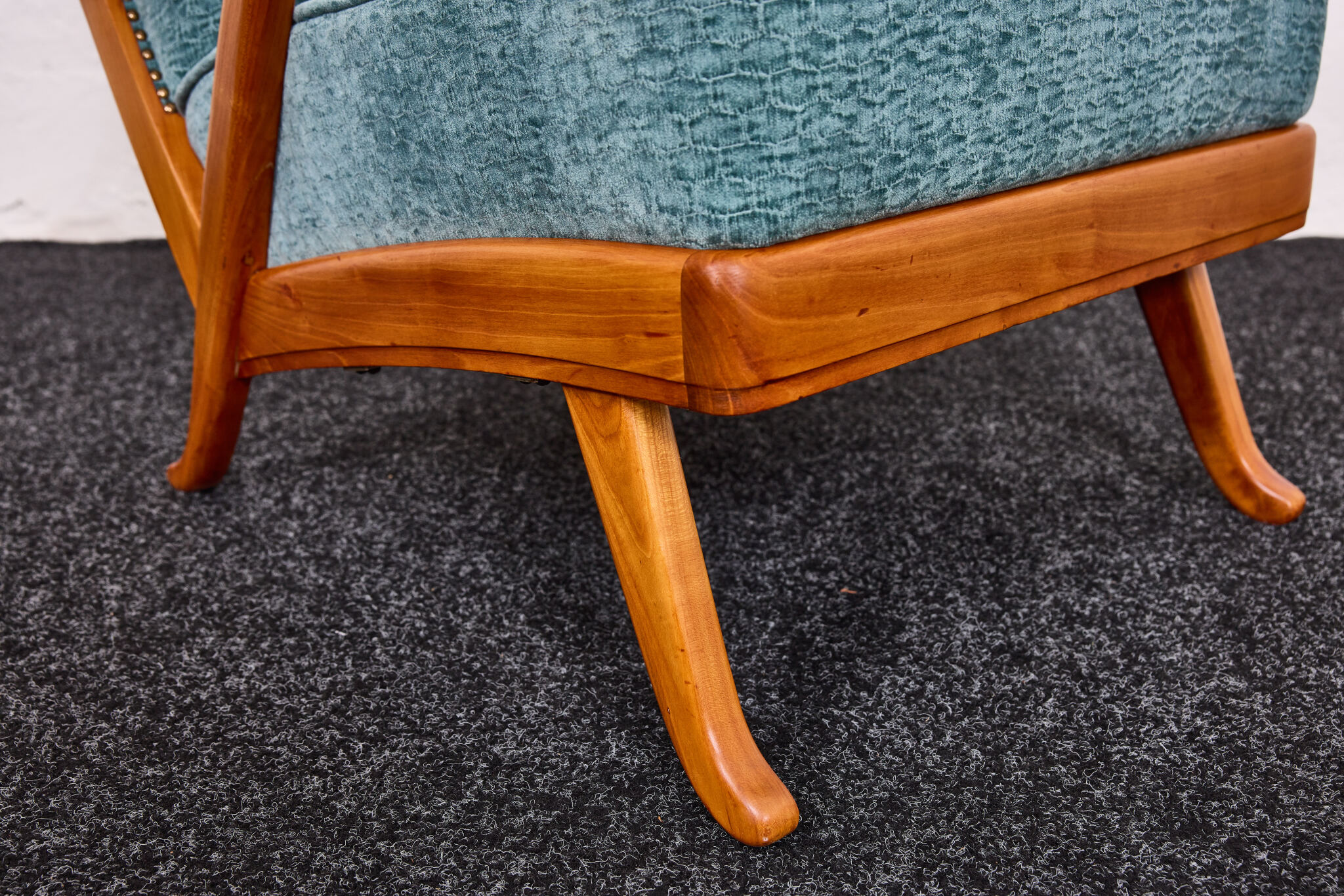 The sculptural frame is crafted from solid cherrywood, showcasing elegantly curved lines, flowing contours, and finely detailed joinery. Its dynamic silhouette is enhanced by gracefully arched armrests and gently splayed legs, offering both visual lightness and structural strength.
