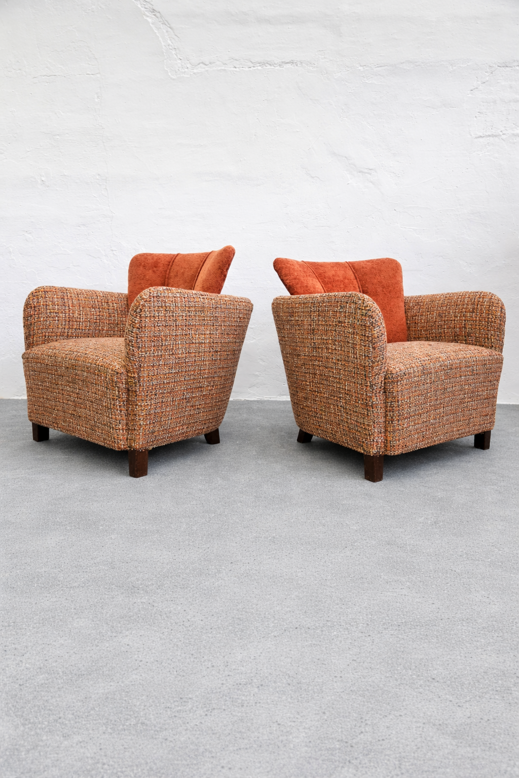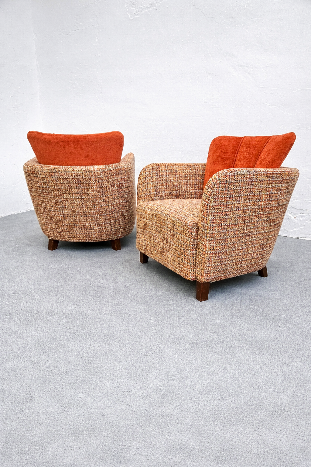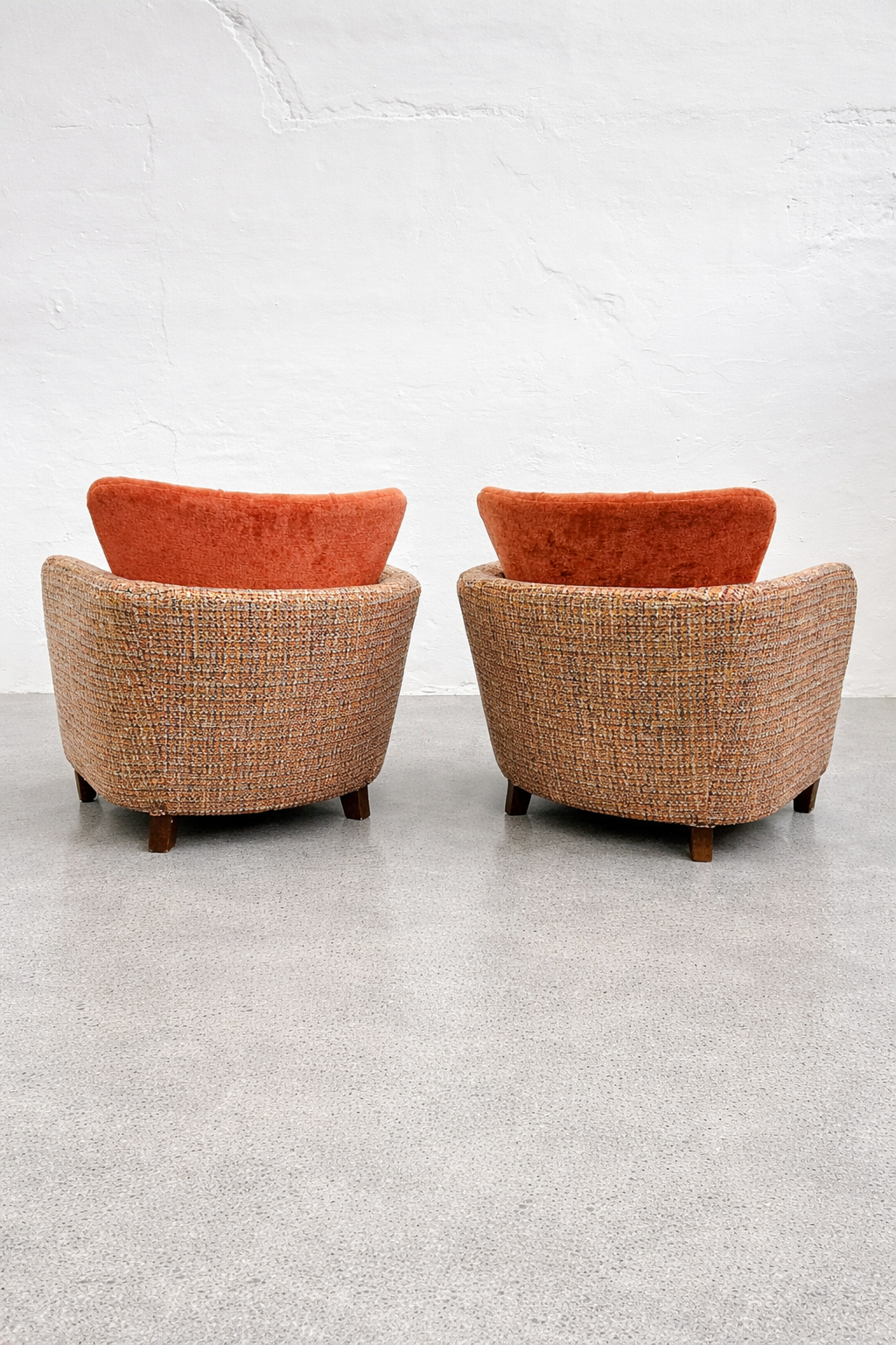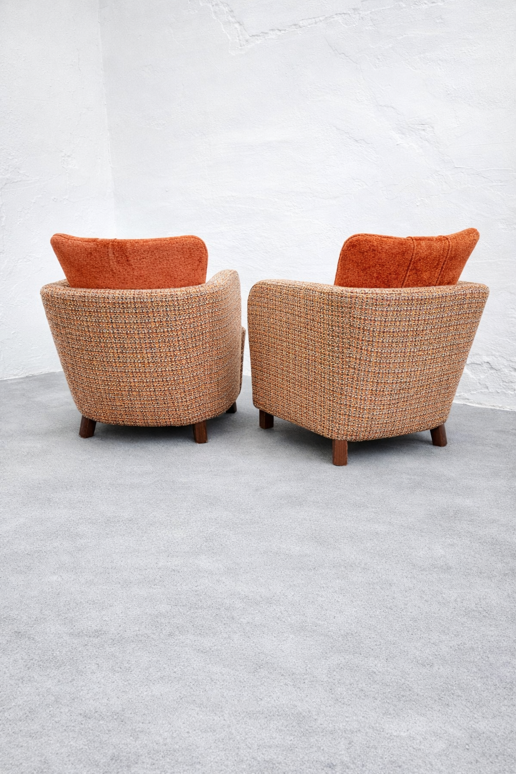 The removable back cushion is a key feature, both functionally and visually, softening the otherwise solid, sculptural mass of the chair. The upholstery is executed in a premium, high-weight, wool-based Minotti tapestry textile, featuring a rich, boucle-like texture. Its nuanced composition of rust, ochre, and burnt orange tones is harmoniously paired with the velvet back cushions, emphasizing the chair’s sculptural presence. Exceptionally comfortable, this is a rare, documented, collector-quality piece.