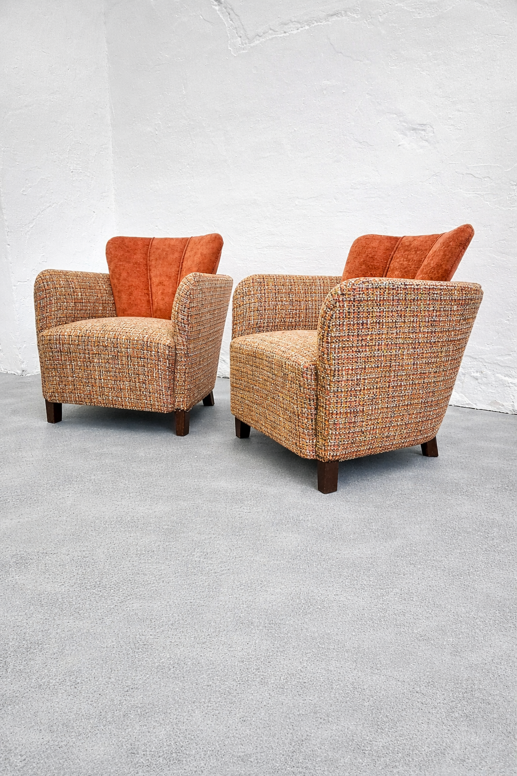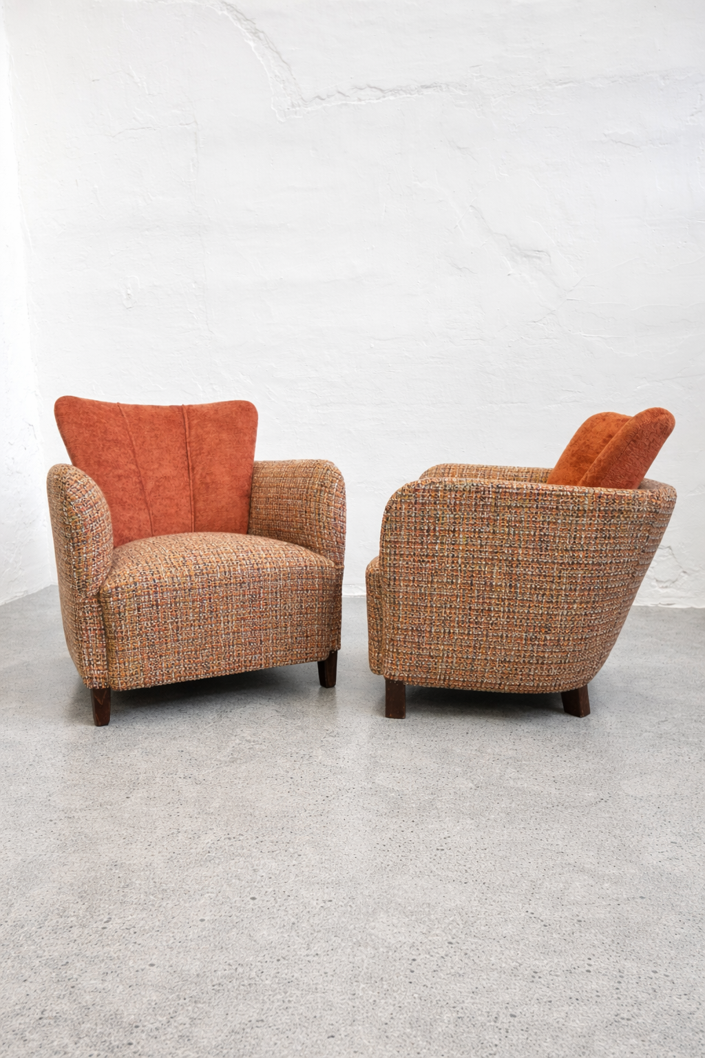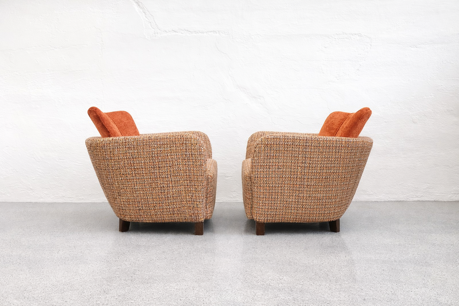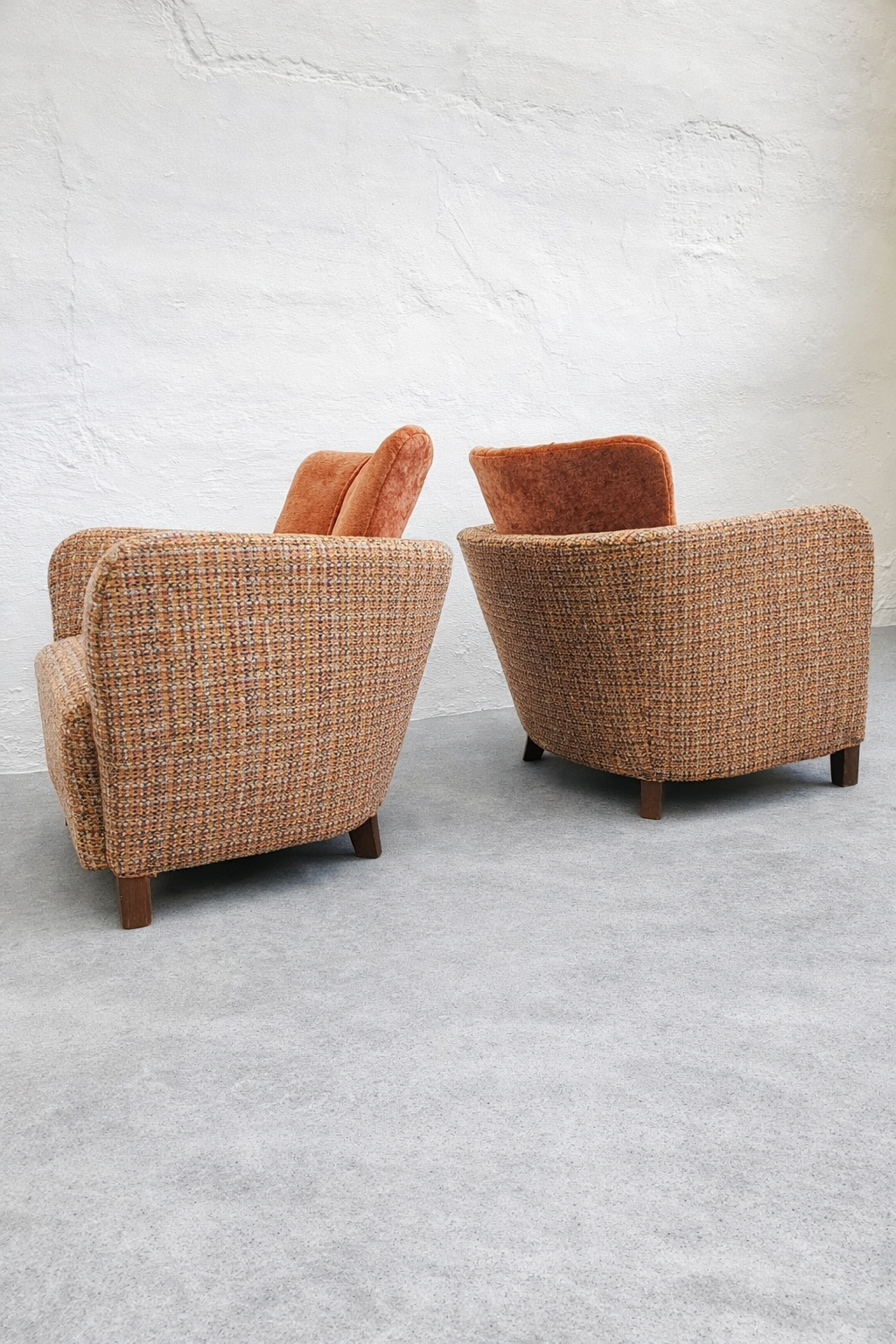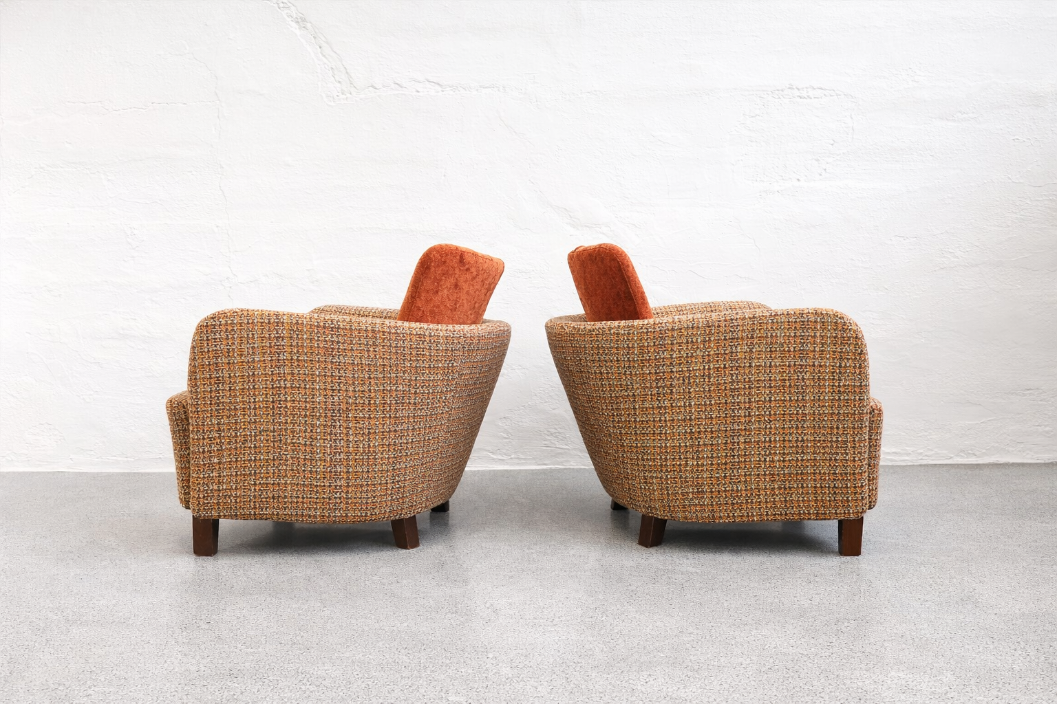 The removable back cushion is a key feature, both functionally and visually, softening the otherwise solid, sculptural mass of the chair. The upholstery is executed in a premium, high-weight, wool-based Minotti tapestry textile, featuring a rich, boucle-like texture. Its nuanced composition of rust, ochre, and burnt orange tones is harmoniously paired with the velvet back cushions, emphasizing the chair’s sculptural presence. Exceptionally comfortable, this is a rare, documented, collector-quality piece.