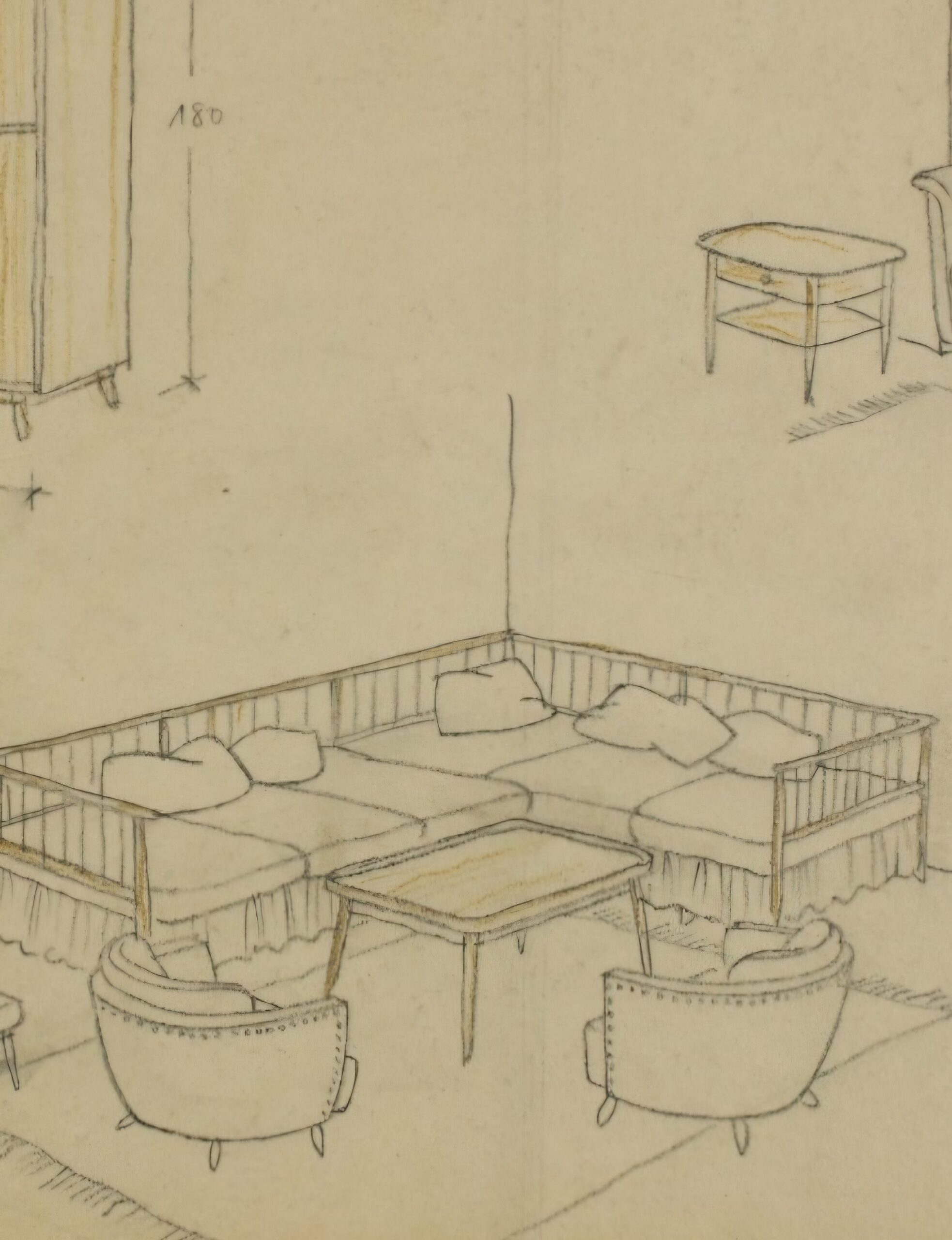This pair of armchairs is identified and documented based on interior designs by Kaesz Gyula from circa 1940–42, supported by an original hand-drawn plan. The form is low and of medium club size, with a distinctly lounge-oriented character. The notably reclined backrest reflects the comfort-driven design approach of the period.