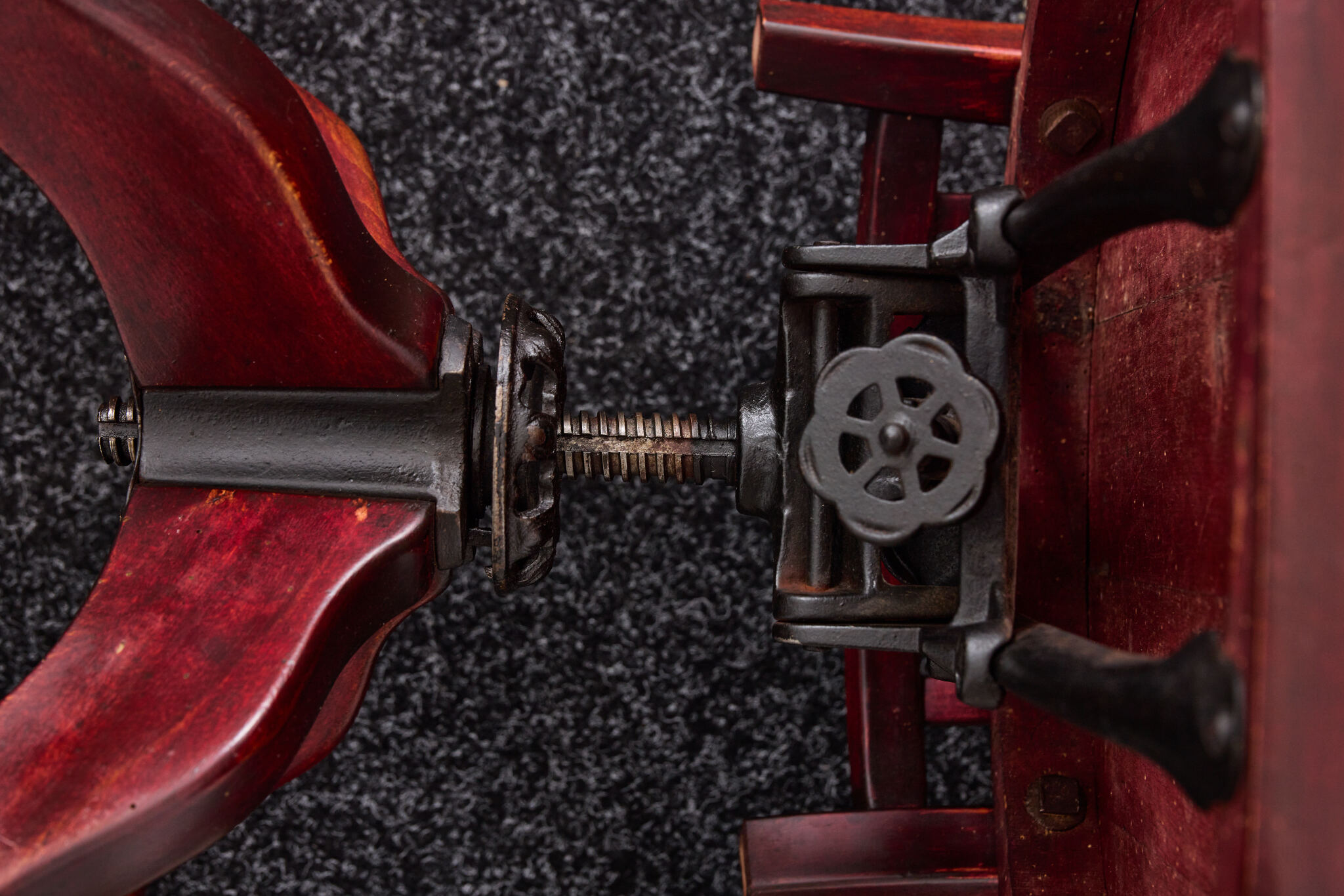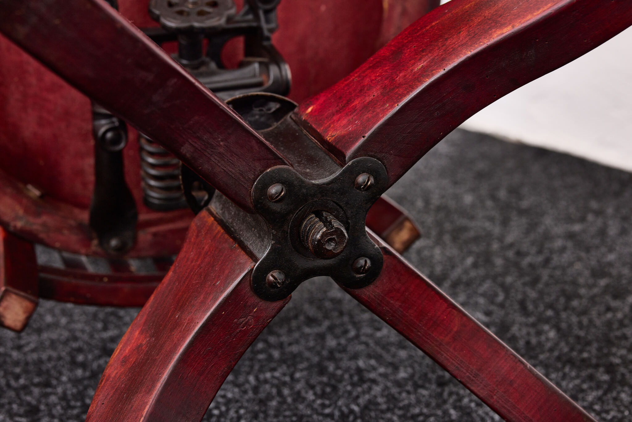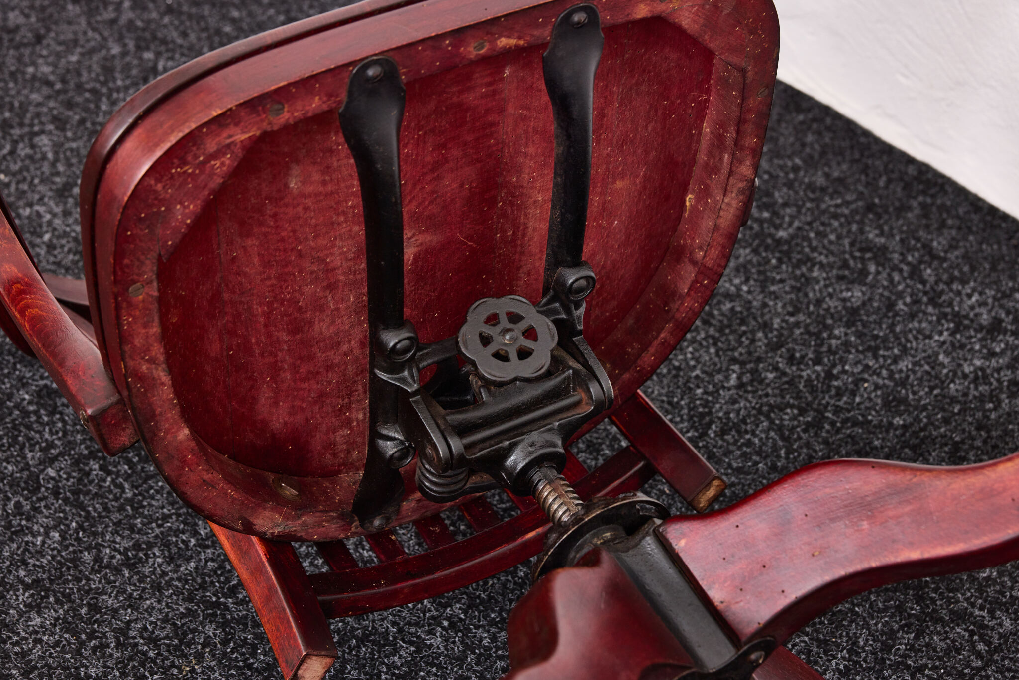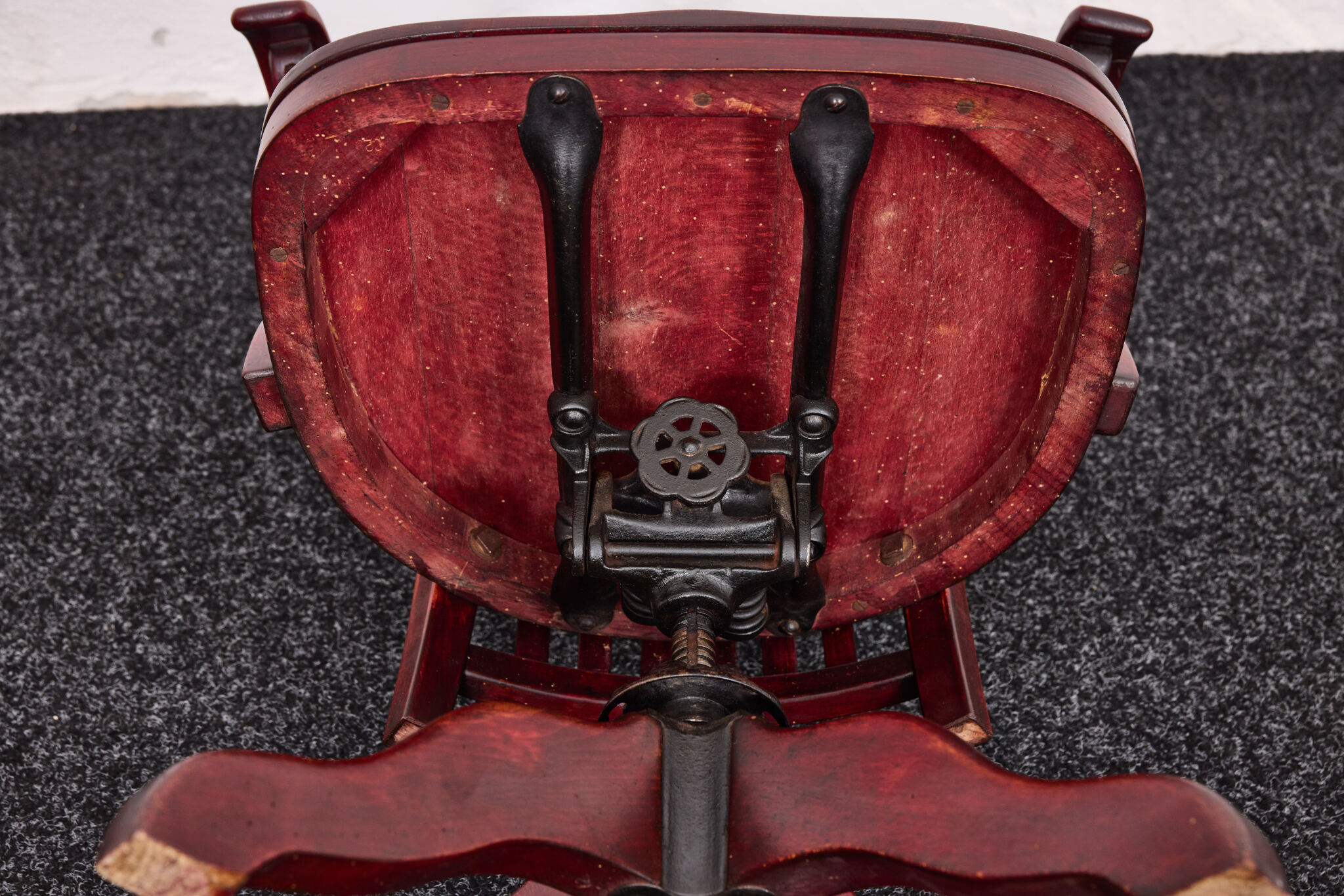 “The chair has been treated with natural beeswax; the original cast iron mechanism has been carefully cleaned and oiled.”